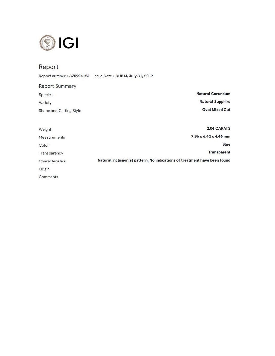 Indulge in the allure of this captivating unheated sapphire gemstone. The gemstone boasts an oval shape and a brilliant cutting style, showcasing the deep blue hue. A timeless treasure, this sapphire radiates sophistication and charm. Includes an International Gemological Institute Report.